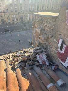 Des gravats sont déjà tombés sur la toiture voisine. D'autres ont atterri directement sur la place.