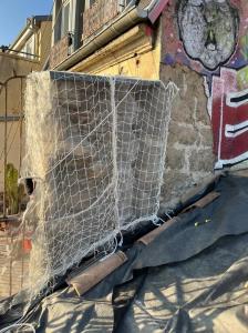 Un filet pare-gravats est mis en place pour contenir tout ce qui pourrait encore se détacher.